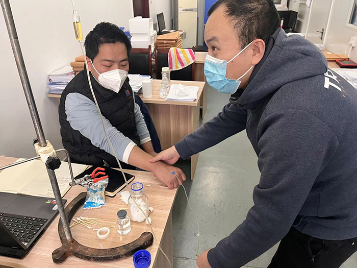 “哪位同事会输液?”一声令下孙江挺身而出来到三厂给王润伟输液扎针。由于第二天孙江工作需要脱不开身,眼看好转的王润伟没有人给输液了,这可怎么办?我跟王润伟说我扎过兔子,我敢下手,但是不一定能扎进去,你敢吗?他笑笑说:“你在我这练练就会了。”我拿起输液器尝试了两次仍没有扎进去,紧张的我出了一身汗,抬头看看王润伟我十分抱歉的说:“真不好意思,两针都没进去。”他毫不在意的笑着说:“没事多扎几针就行了。”但是在强大的心理压力下,我不敢再次尝试。张总又一次紧急寻找能输液扎针的人,最后找到了只扎过两次针的道恩化验室微生物组组长吕文杰。吕文杰看看王润伟的手说:“你这确实不好扎。”两针下去又没有成功。扎过针的人都知道越是扎不中血管疼痛就会越剧烈,王润伟没有任何责备,一直保持着微笑,说到:“咱们换只手扎吧。”又一针下去终于成功了。吕文杰如释重负,擦了擦头上的汗对王润伟竖起了大拇指。